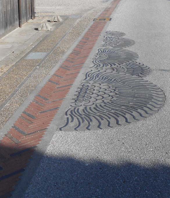 人形小路は、道路に埋められた瓦をたどって歩けば
