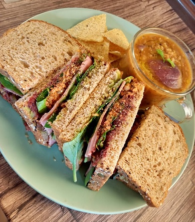 『二十一穀ブレッドのサンドイッチとレンズマメのスープ』